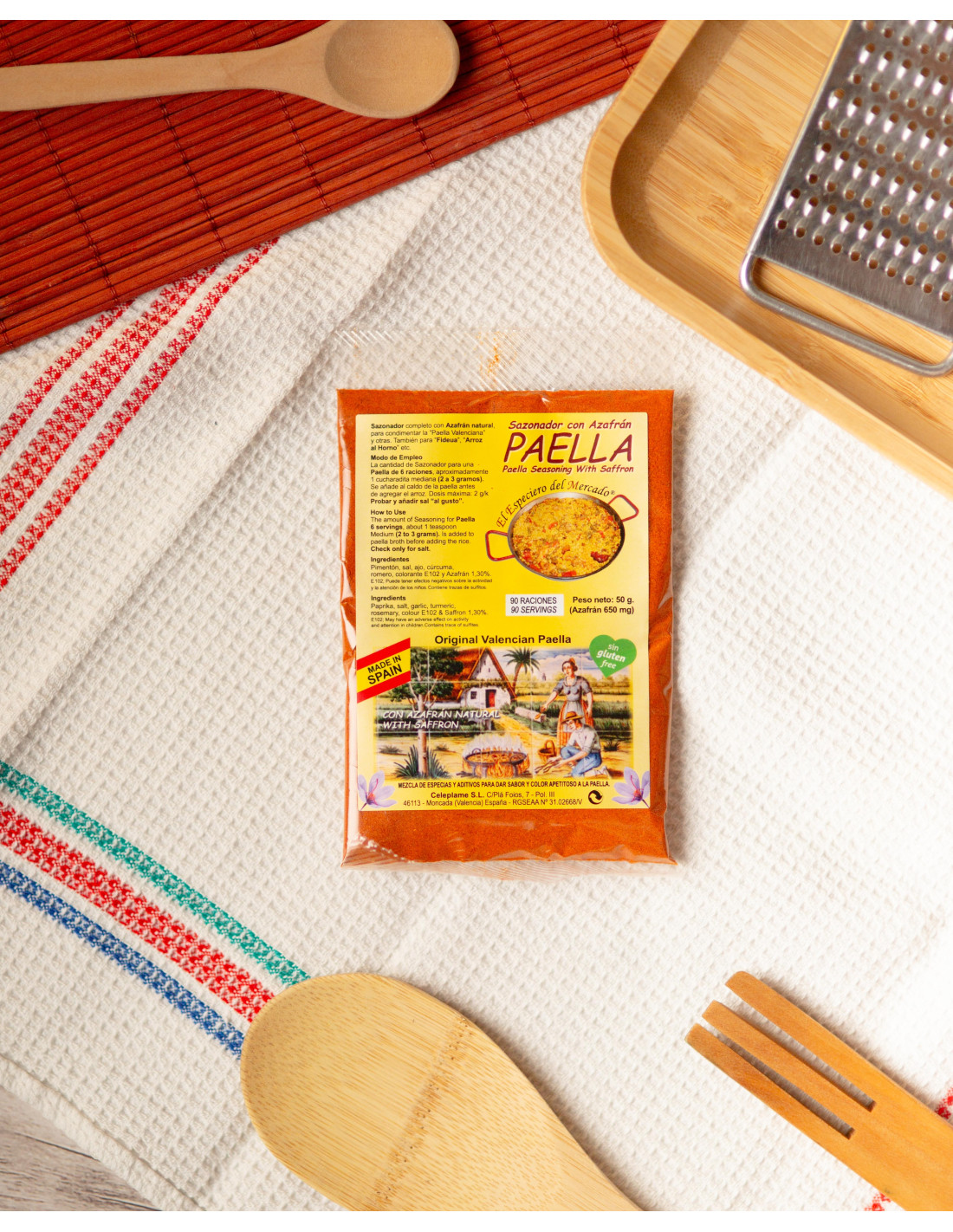 Mezcla de especias diseñada especialmente para realzar el sabor y el color de la paella. Contiene pimentón, ajo, cúrcuma, romero, colorante y un 1,30 % de azafrán, que aporta su aroma característico y su tono dorado natural. Ideal para paellas de carne, marisco, verduras o mixtas.