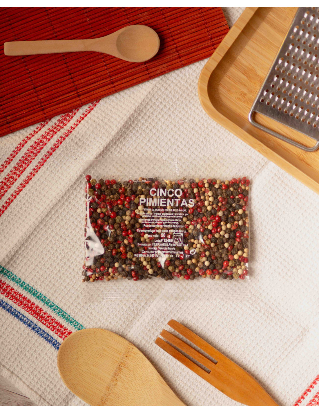 Mezcla de pimienta negra, pimienta blanca, pimienta verde, pimienta rosa y cilantro en grano.