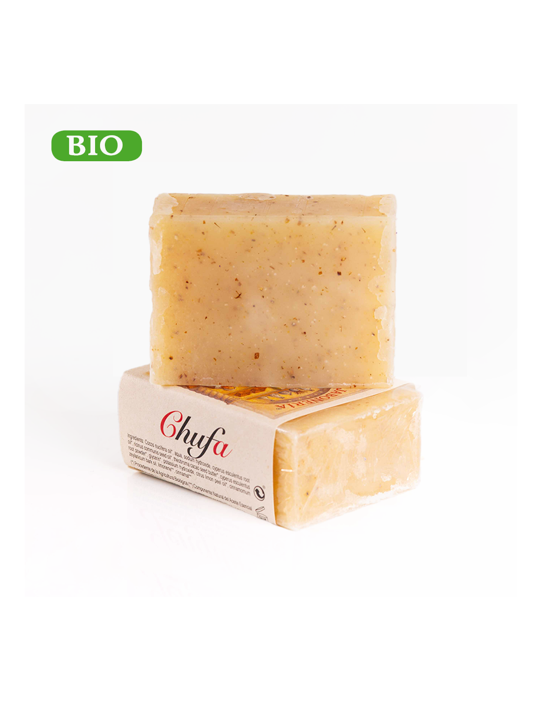 Jabón ecológico elaborado con el extracto y el aceite de los tubérculos de la chufa. Auténtico jabón de horchata, suave, hidratante y con aroma dulce. Las chufas son ricas en ácido oleico, magnesio, tocoferoles y sobre todo en biotina, que aporta valiosas propiedades contra la dermatitis y prevención de la sequedad de la piel.