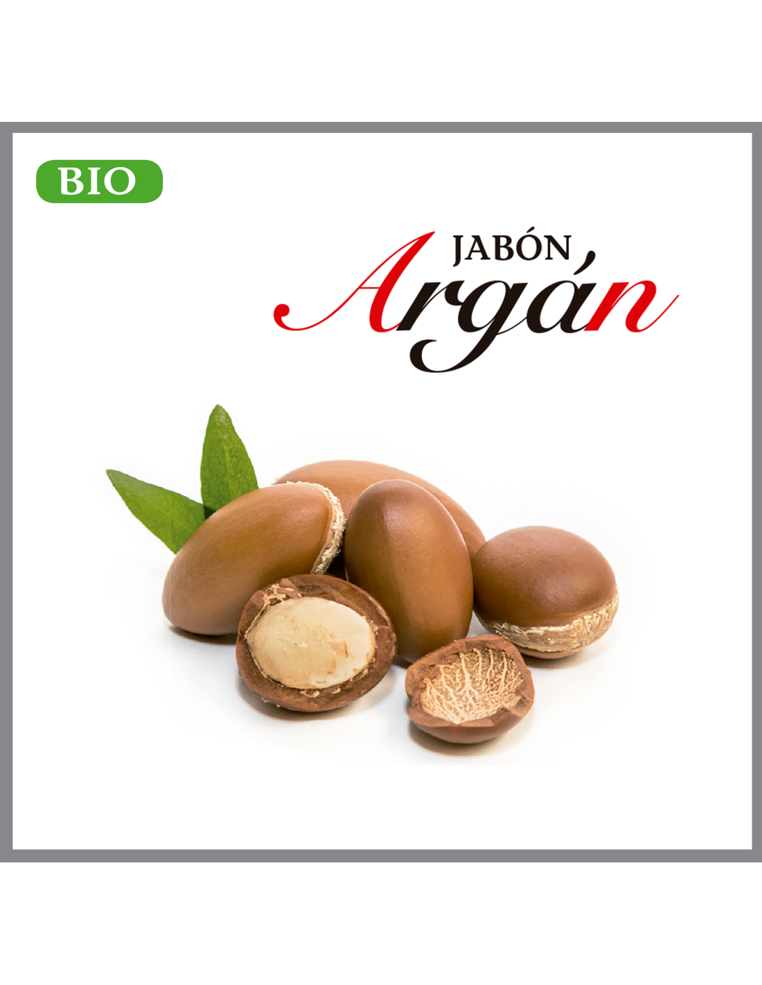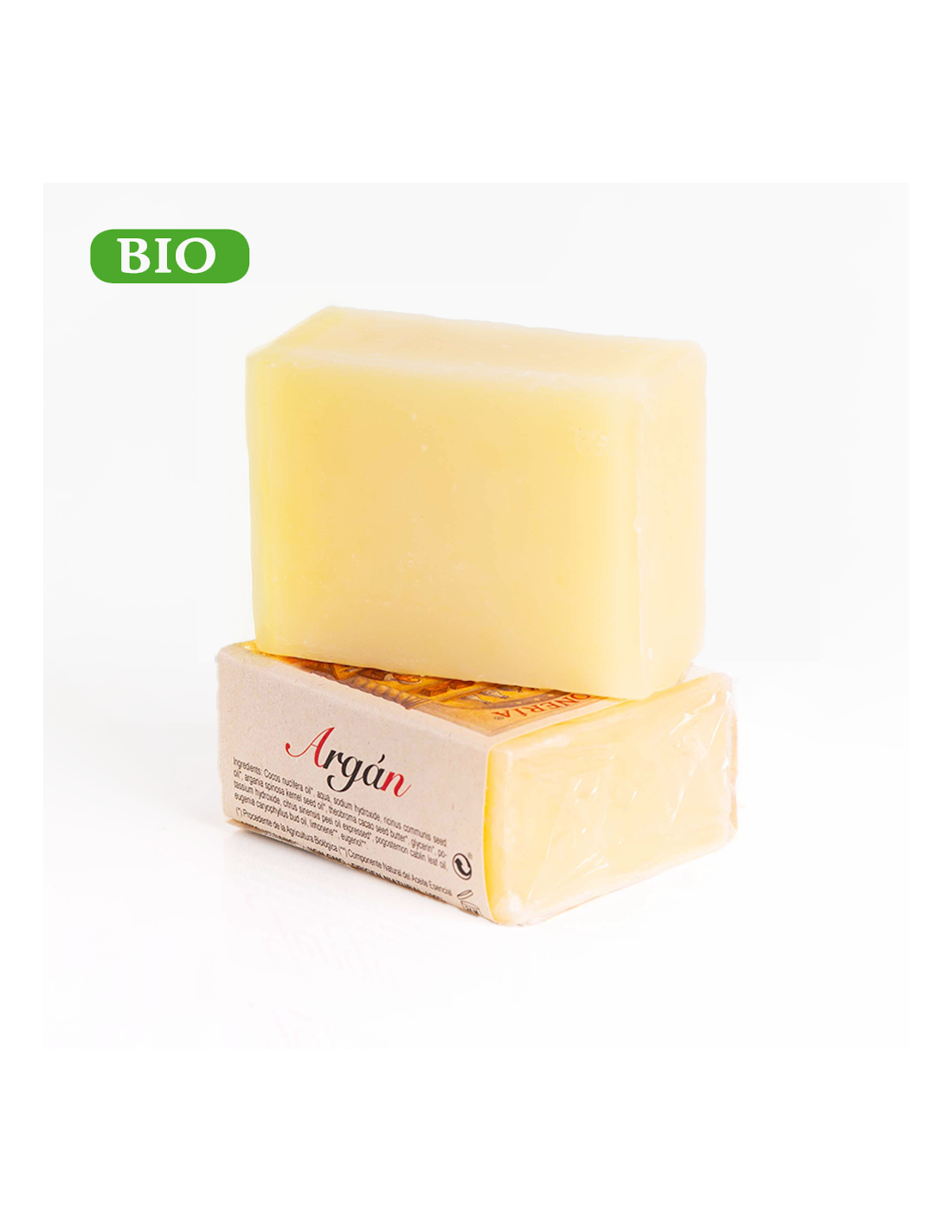 Jabón ecológico elaborado con el aceite de argán, tesoro del desierto. Este aceite se extrae de las semillas maduras del arbusto espinoso llamado argán, abundante en la zona bereber de Marruecos. Su alto contenido en ácidos grasos esenciales y tocoferoles lo hace muy útil para el cuidado de las pieles con signos de envejecimiento dándole flexibilidad y tersura, disimulando arrugas y estrías. Incluso es muy eficaz para pieles grasas con tendencia acneica.