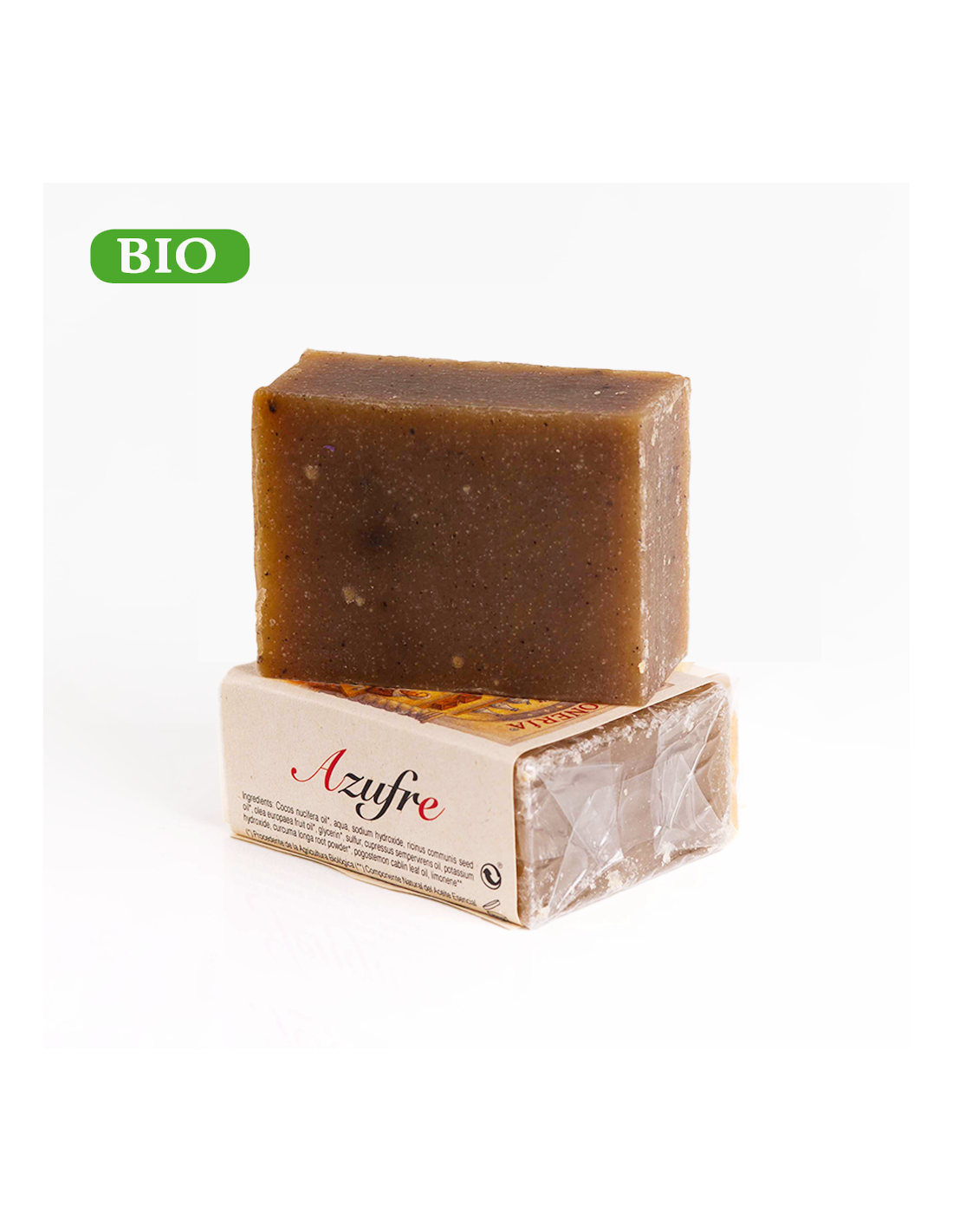 Aceite de Coco*, aceite de Ricino*, aceite de oliva virgen extra*, glicerina vegetal*, cúrcuma*, azufre, aceites esenciales de ciprés y patchouly, más el álcali natural necesario para la saponificación.