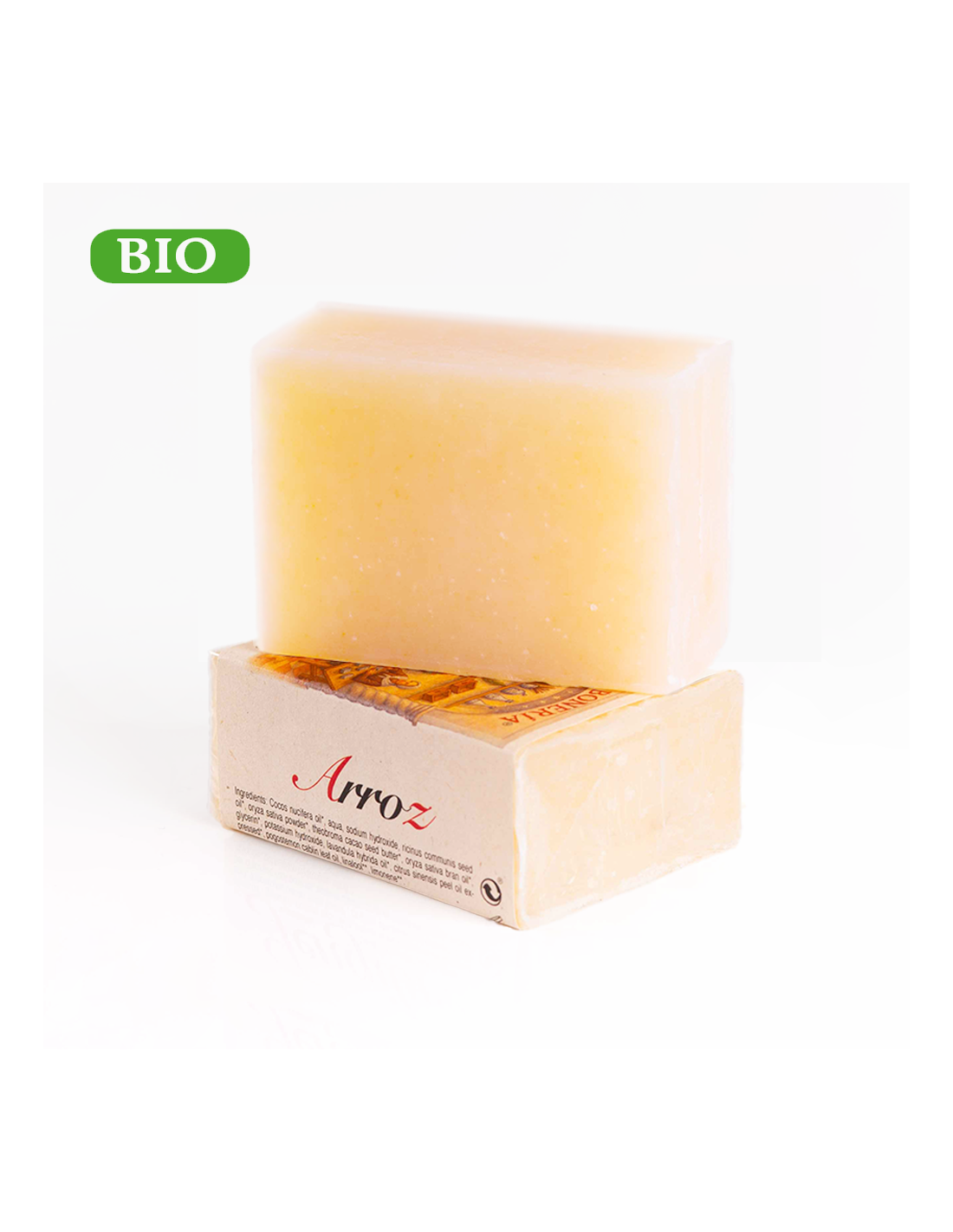 Jabón ecológico elaborado con Harina de Arroz y Aceite de Arroz. El aceite de arroz es rico en vitamina E, en Omega 3 y Omega 6, también contiene coenzima Q10. Es eficaz para blanquear y atenuar las manchas faciales igualando el tono, dando un aspecto radiante. El aceite de Arroz es muy eficaz contra los signos de envejecimiento de la piel, aportándole flexibilidad y tersura, disimulando arrugas y estrías.