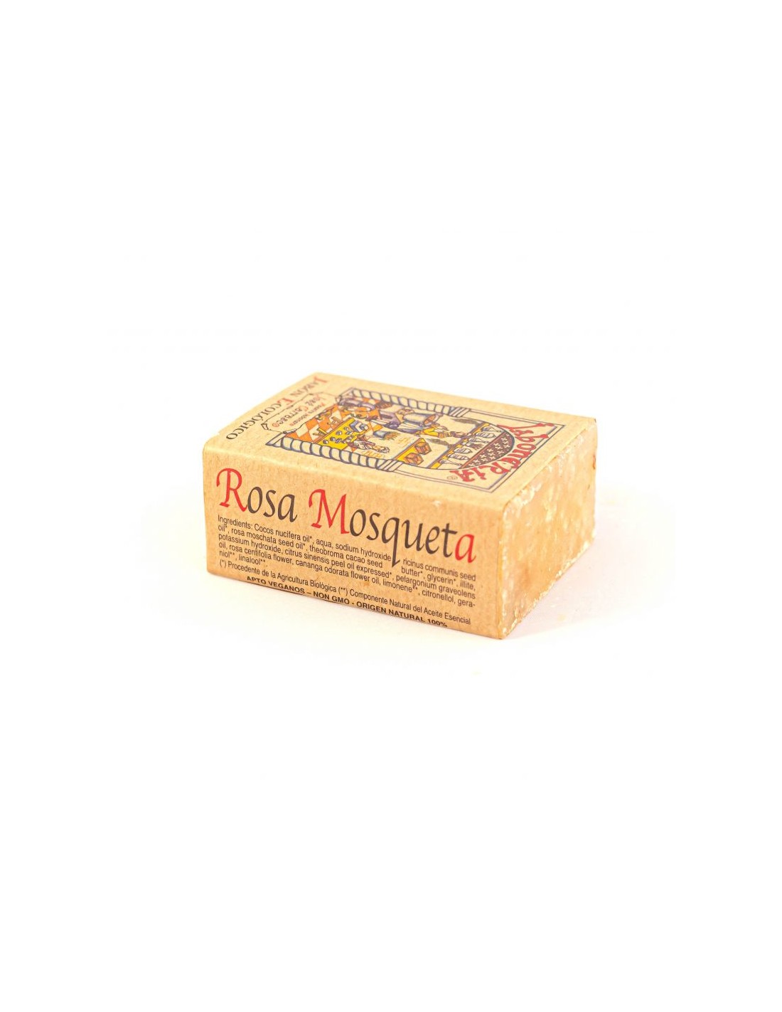 Jabón elaborado con el antiguo proceso de saponificación en frio, realizado artesanalmente por nuestro maestro jabonero valenciano José Carrasco, obteniendo un jabón rico en glicerina natural de la saponificación, suave, cremoso y de gran calidad. Todas las materias primas son de origen natural y más del 90% ecológicas. Entre sus ingredientes destacamos las propiedades regeneradoras y antioxidantes del aceite de Rosa Mosqueta. Recomendado para la limpieza y cuidado de todo tipo de pieles.